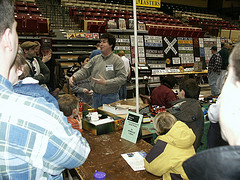 Michael had the presence of mind to document our “process” of setting up on Friday. Not much can happen until Kevin arrives with the van and the tables. Our layout was by Bob Hayes.